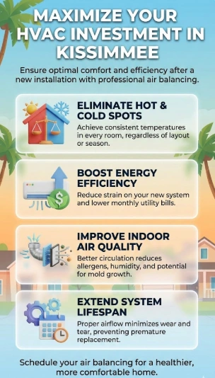 We regularly see brand-new units underperform because nobody balanced the distribution. Kissimmee's 90°F+ summers and 70%+ humidity make this step critical.